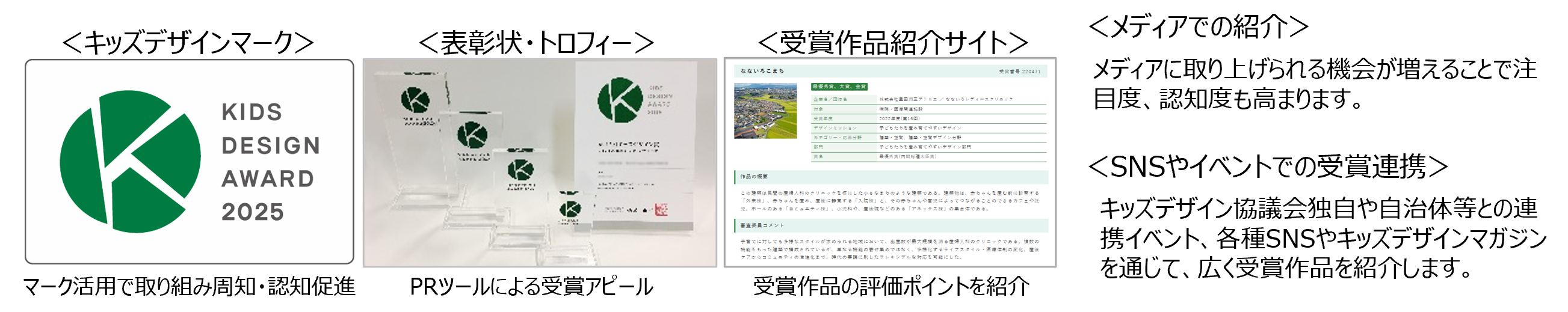 受賞した作品はキッズデザインマークの使用ほか、PRツールでの受賞をアピールすることができます(いずれも有償)。受賞作品は公式サイトやSNSでの配信、各種展示会での紹介なども実施します。