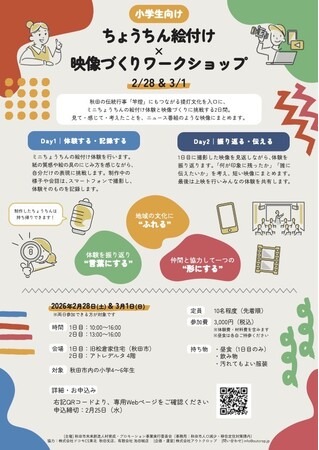 秋田の伝統行事「竿燈」にもつながる提灯文化を入り口に、ミニちょうちんの絵付け体験と映像づくりに挑戦する2日間のプログラムです。