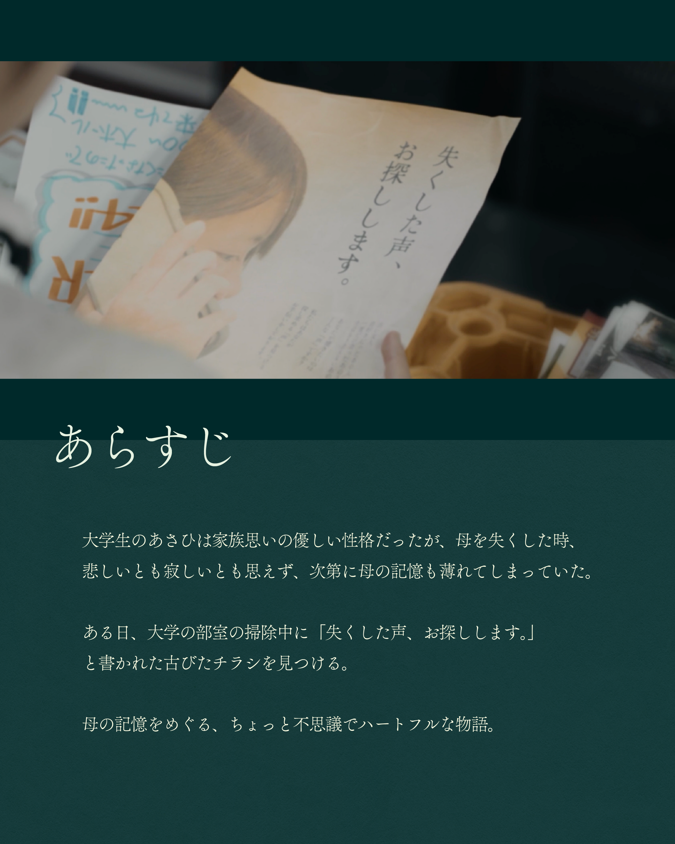 ある日、大学の部屋の掃除中に「失くした声、お探しします。」と書かれた古びたチラシを見つける。