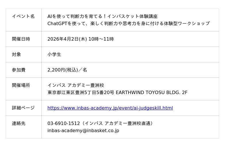 株式会社インバスケット研究所(本社:東京・江東区、代表取締役社長:鳥原隆志)は、 小学生を対象に、ChatGPTを使いながら “考えて決める力” を育てる体験型イベント を インバス アカデミー豊洲校にて4月2日(木)に開催します。
