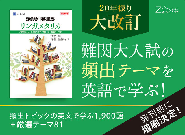 株式会社増進会ホールディングス(Z会グループ)のグループ会社、株式会社Z会ソリューションズは、『話題別英単語 リンガメタリカ[改訂第2版]』を2月20日(金)に発刊いたします。激変する現代社会と最新の入試トレンドを反映し、20年ぶりの全面改訂となります。