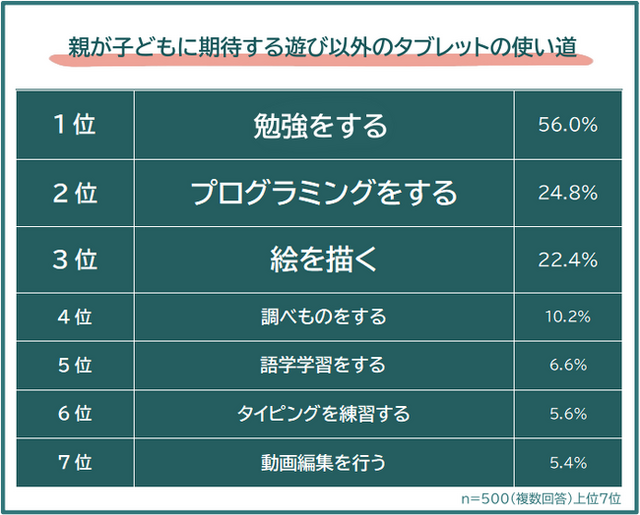 親が子どもに期待する遊び以外のタブレットの使い道1位は「勉強をする」