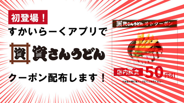 ガスト、しゃぶ葉、バーミヤンなどのすかいらーくグループ店舗で使用できる【すかいらーくアプリ】では、お得なクーポン“オトクーポン”をお届けしています。資さんうどんでは、来月3月に100店舗目の出店を迎えるにあたり、これからも多くの皆さまに資さんうどんをお得にご利用いただきたいという想いから、この【すかいらーくアプリ】にてお得なクーポン“オトクーポン”配布開始の運びとなりました。