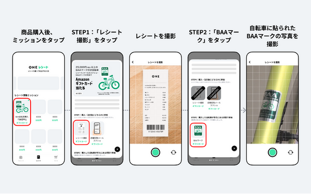 「BAA自転車を買ったレシートで当てよう!Amazonギフトカードプレゼントキャンペーン」は、BAAマーク付き自転車の普及を目的とした取り組みです。キャンペーン参加者は、購入時のレシート(オンライン購入の場合は、購入完了メール)と購入自転車の写真をONEで撮影・投稿することで、抽選で500名様に5,000円分のAmazonギフトカードが当たります。