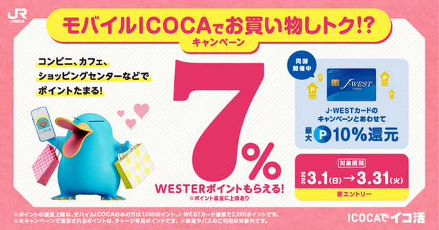 モバイルICOCAにJ-WESTカードを紐づけている方は最大2,000ポイント