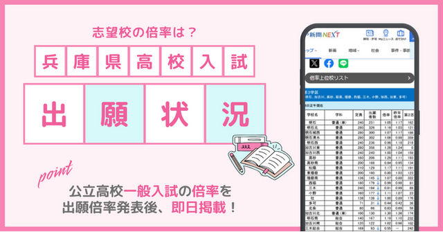 神戸新聞の電子版「神戸新聞NEXT」では、兵庫県の公立高校一般入試の出願状況を、2月25日(水)夕方頃より速報します。出願開始から志願変更、最終確定まで、複数回にわたって速報するため、志望校の状況確認や出願変更を考える際の判断材料として活用できます。
