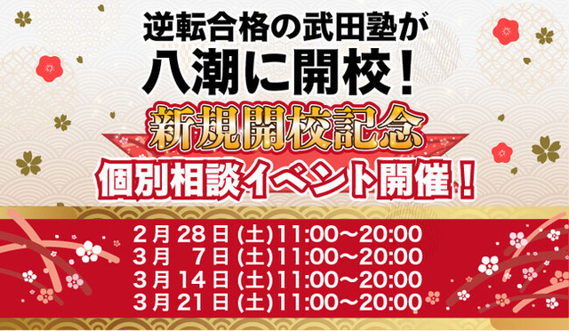 学習塾「武田塾」を全国に展開している株式会社A.ver(本社:東京都文京区 以下「武田塾」)は、2月23日、埼玉県八潮市に武田塾八潮校を開校することをお知らせいたします。武田塾八潮校の開校を記念して、八潮校では個別相談イベントを実施いたします。開催予定は以下の通りです。2月28日(土) 11:00~20:003月7日(土) 11:00~20:003月14日(土) 11:00~20:003月21日(土) 11:00~20:00