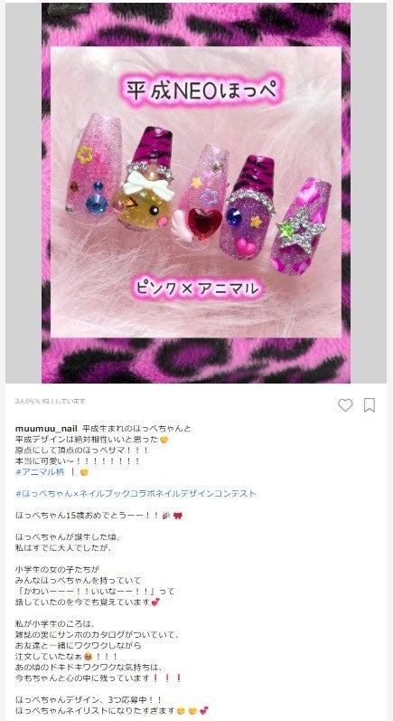 そして準グランプリはmuumuu_nail様。平成NEOほっぺちゃんネイルというテーマで、なつかしくてエモーショナルな作品が素晴らしく、またほっぺちゃんやサン宝石への愛にあふれるコメントにスタッフも大感激。グランプリと甲乙つけがたく、最後まで非常に迷いました![画像5: https://prcdn.freetls.fastly.net/release_image/148433/58/148433-58-409c73690aeaceb0bddee50e1d940ff3-435x797.jpg?width=536&quality=85%2C75&format=jpeg&auto=webp&fit=bounds&bg-color=fff ]