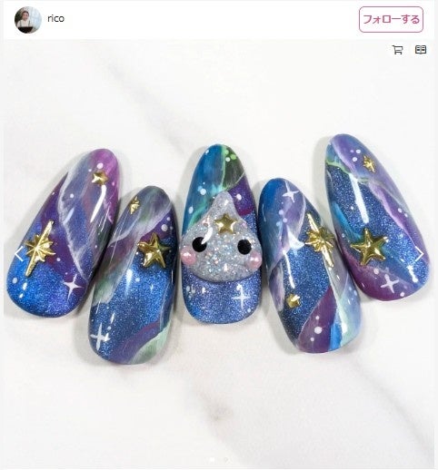 特に以下作品は、サン宝石でもに人気の星やキラキラを再現しており、原作への理解の深さや未来への期待。今後サン宝石のPOPUPなどで「かつての少女たち」が喜ぶネイルアートであると思い、評価させていただきました。
