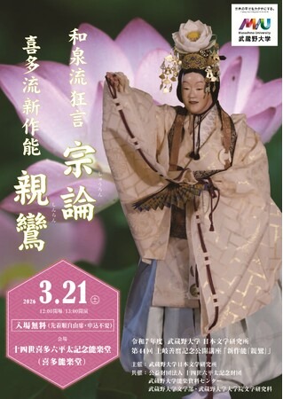 武蔵野大学日本文学研究所(所長:土屋 忍)は、3月21日(土)に令和7年度第44回土岐善麿記念公開講座「新作能<親鸞>」を十四世喜多六平太記念能楽堂(喜多能楽堂:東京都品川区)で開催します。本講座では、演目解説の後、第1部として狂言「宗論」を、第2部として能「親鸞」を上演します。上演後には「本日の演目に寄せて」と題し、演目の解説などを座談会形式で行います。