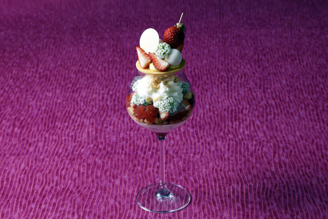 トップには、いちごアイスやカスタード、みずみずしいフレッシュいちごをあしらったタルトを飾り、グラスの中には、甘酸っぱいいちごソースとなめらかなパンナコッタ、香ばしいアーモンド入りクランブル、いちごのコンポートやゼリーを重ねました。いちごの芳醇な甘みと香りに加え、クリスピーな食感や滑らかな口どけが織りなす、多彩な食感の移ろいをお楽しみいただけます。毎月訪れるたびに、異なる品種の繊細な違いを味わいながら、奥深いいちごの魅力をご堪能ください。