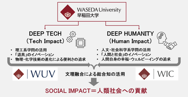 早稲田大学は、2050年までに早稲田大学を「世界人類に貢献する大学」に進化させ、総合知による研究・教育・貢献推進活動を通じて、日本社会の変革を牽引することを目指しています。このビジョンのもと、2022年に、建学の精神「早稲田大学教旨」の1つである「学問の活用」を図るベンチャー企業を創出・育成し、社会価値創造の取り組みを加速することを本旨とした「早稲田大学ベンチャーズ株式会社(WUV)」を設立しました。WUVでは、とりわけ理工系を中心としたディープ・テック(Deep Tech)領域の技術シーズの社会実装を支援しています。