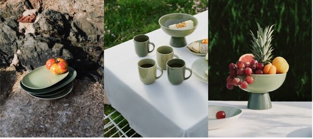 新作アイテムでは、地中海の風や自然光、水面のゆらめきから着想を得たセージグリーンやエバーグリーンなどの新色が登場します。これらのグリーンは、30年前に誕生したオリジナルコレクションのカラーへのオマージュとして再解釈されたものです。透明感のある質感が器に奥行きのある豊かな表情をもたらし、やわらかなフォルムをより一層引き立てます。