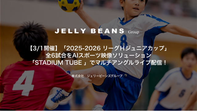この度、株式会社ジェリービーンズグループ(本社:東京都台東区、代表取締役:宮崎 明、以下「当社」)、は、一般社団法人日本ハンドボールリーグが主催する「2025-2026 リーグHジュニアカップ」(2026年3月1日開催/和光市総合体育館)において、業務提携先である株式会社NTTSportictと連携し、AIスポーツ映像ソリューション「STADIUM TUBE」を活用した全6試合のマルチアングルライブ配信およびAI自動映像解析を実施いたします。