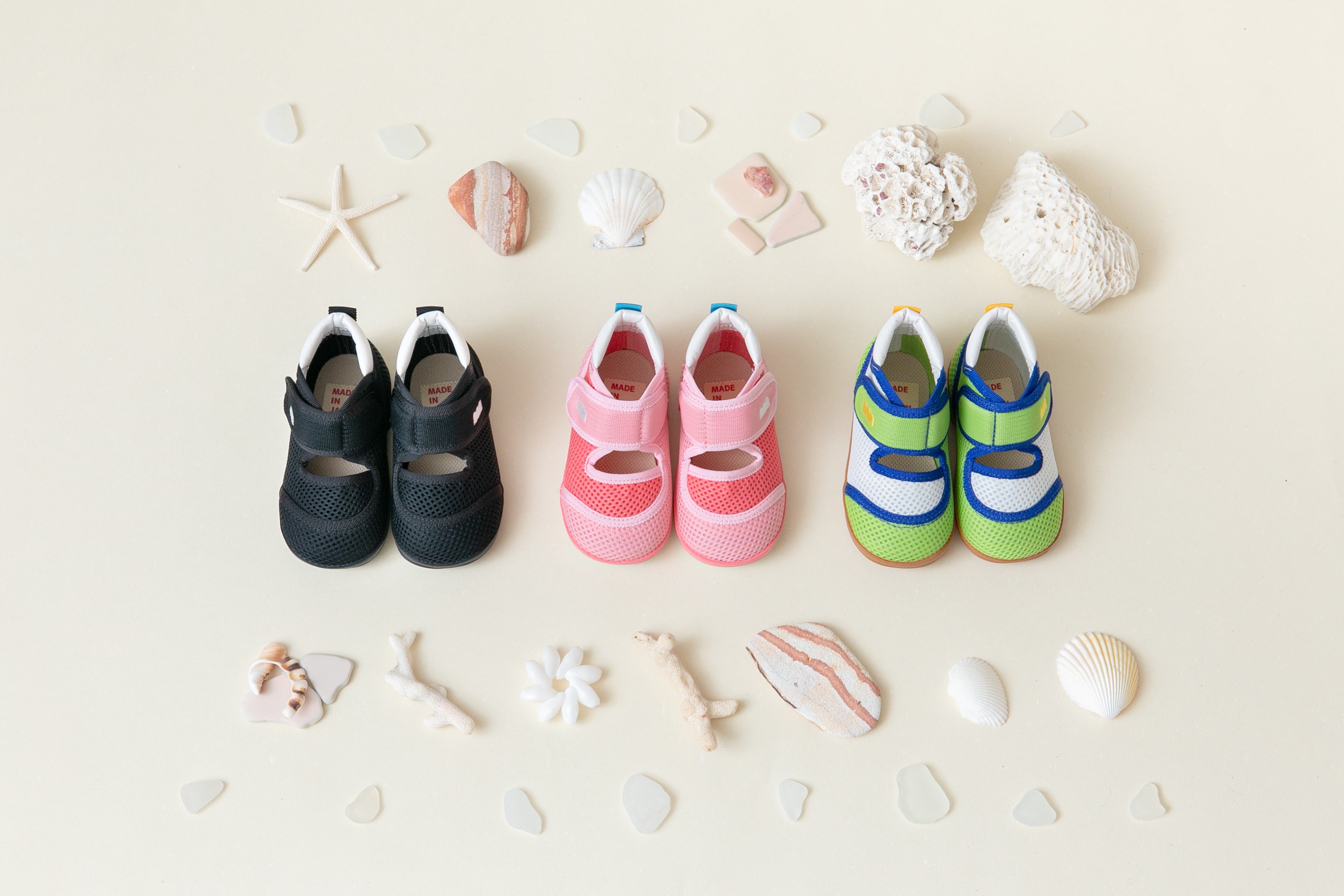 バンドは手前に大きく開くフルオープン仕様で、こどもにも履かせやすい設計です。履き口には足あたりの良いパイル生地を採用し、インソール表面には「みぎ」「ひだり」の文字をプリントしています。季節を問わず着用できるため、ギフトにもおすすめです。