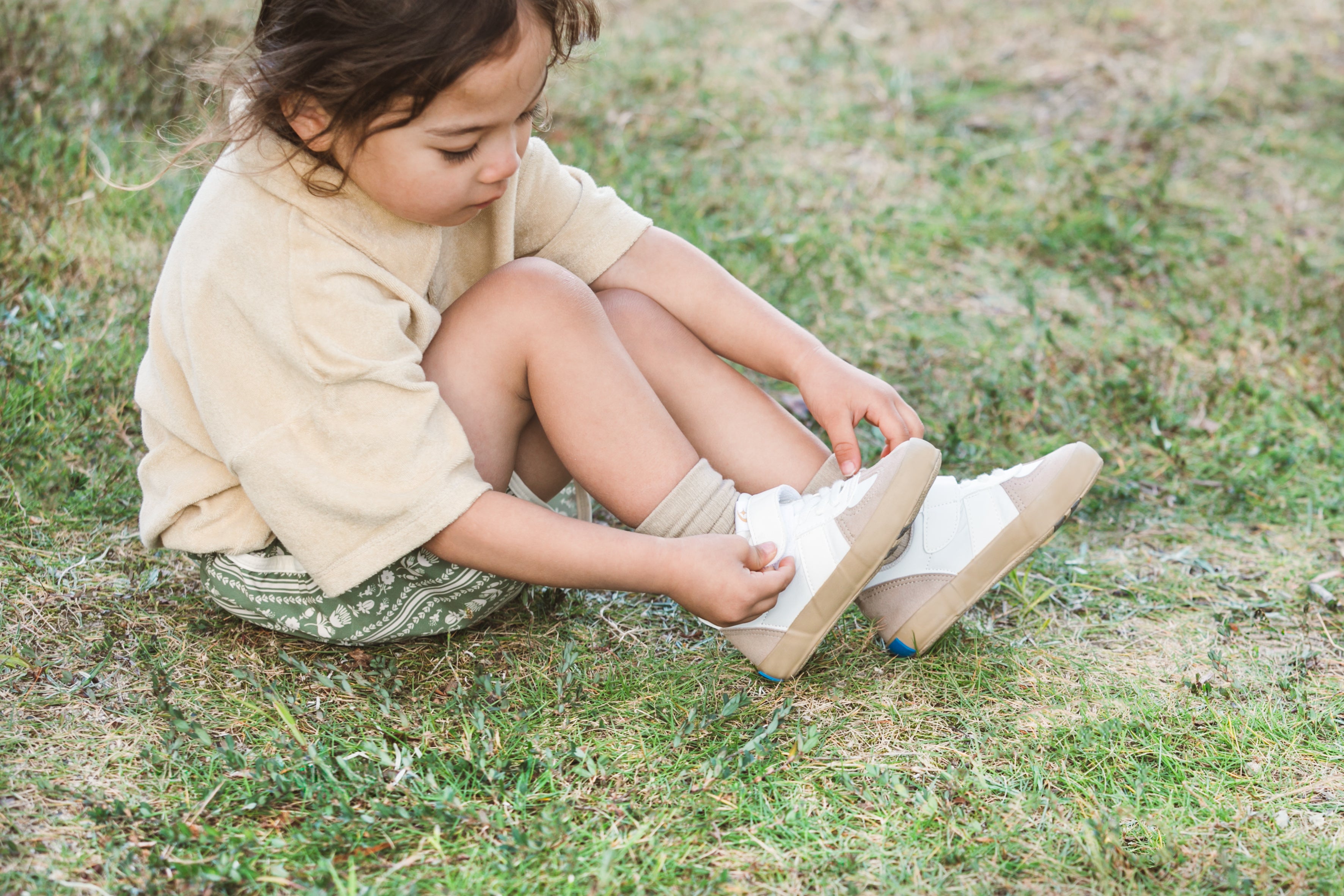こども自身が正しく靴を履けるよう、踵をトントンして履く際の目印となるヒールパッチを採用しています。またインソール表面には「みぎ」「ひだり」の文字をプリントし、毎日の着脱をサポートします。走ったり飛び跳ねたりと運動量が増える時期に配慮し、ソールには摩耗しにくい配合のゴムを使用することで耐久性を向上させました。