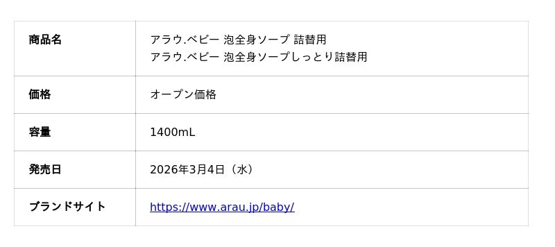 サラヤ株式会社(本社:大阪/代表取締役社長:更家悠介)は、「アラウ.ベビー 泡全身ソープ 詰替用1400mL」を、2026年3月4日(水)より、発売することをお知らせいたします。