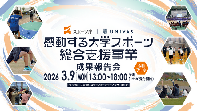 一般社団法人大学スポーツ協会(所在地:東京都千代田区、会長:福原紀彦、以下 UNIVAS)は、スポーツ庁委託事業「令和7年度 感動する大学スポーツ総合支援事業」において採択された15大学18事例による成果報告会を開催します。本イベントでは、各大学の取り組みを発表するとともに、ポスター展示を通じて情報交換を促進し、「大学スポーツ×地域」の未来について考える機会を創出します。