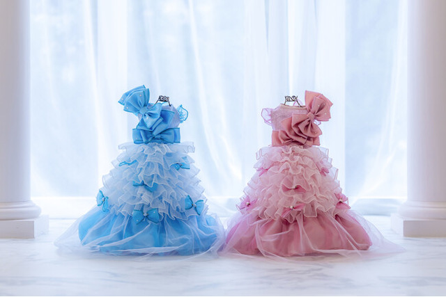 「ミラクルジェミニ」は、シンメトリーにデザインされたまるで双子のようなブルーとピンクのドレスです。フリルを取り外すことで印象が変わる、2WAY構造を採用しています。