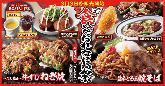 株式会社物語コーポレーション(本社:愛知県豊橋市/代表取締役社長:加藤 央之)が全国で20店舗を展開する『お好み焼本舗』(以下、おこほん)は、2026年3月3日(火)から2026年6月上旬まで期間限定メニュー「食いだおれなにわ祭」を販売いたします。