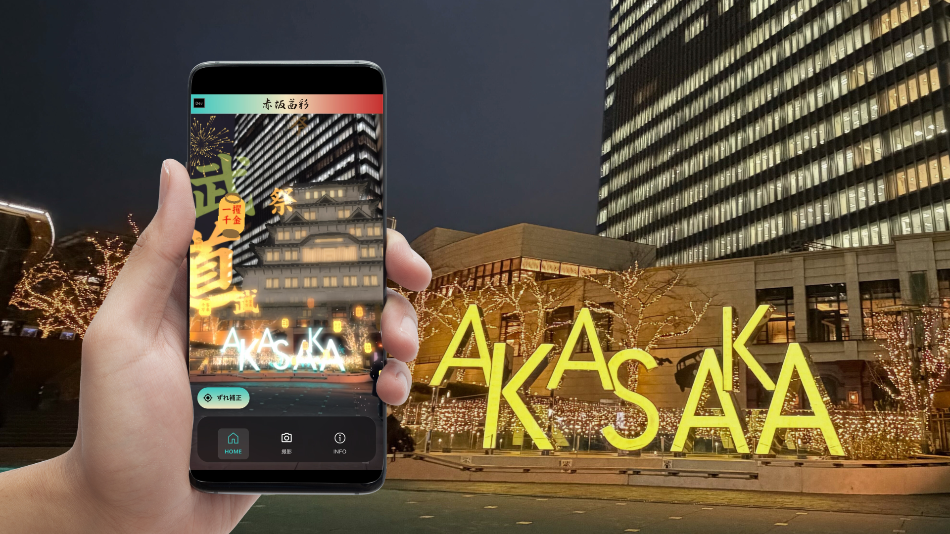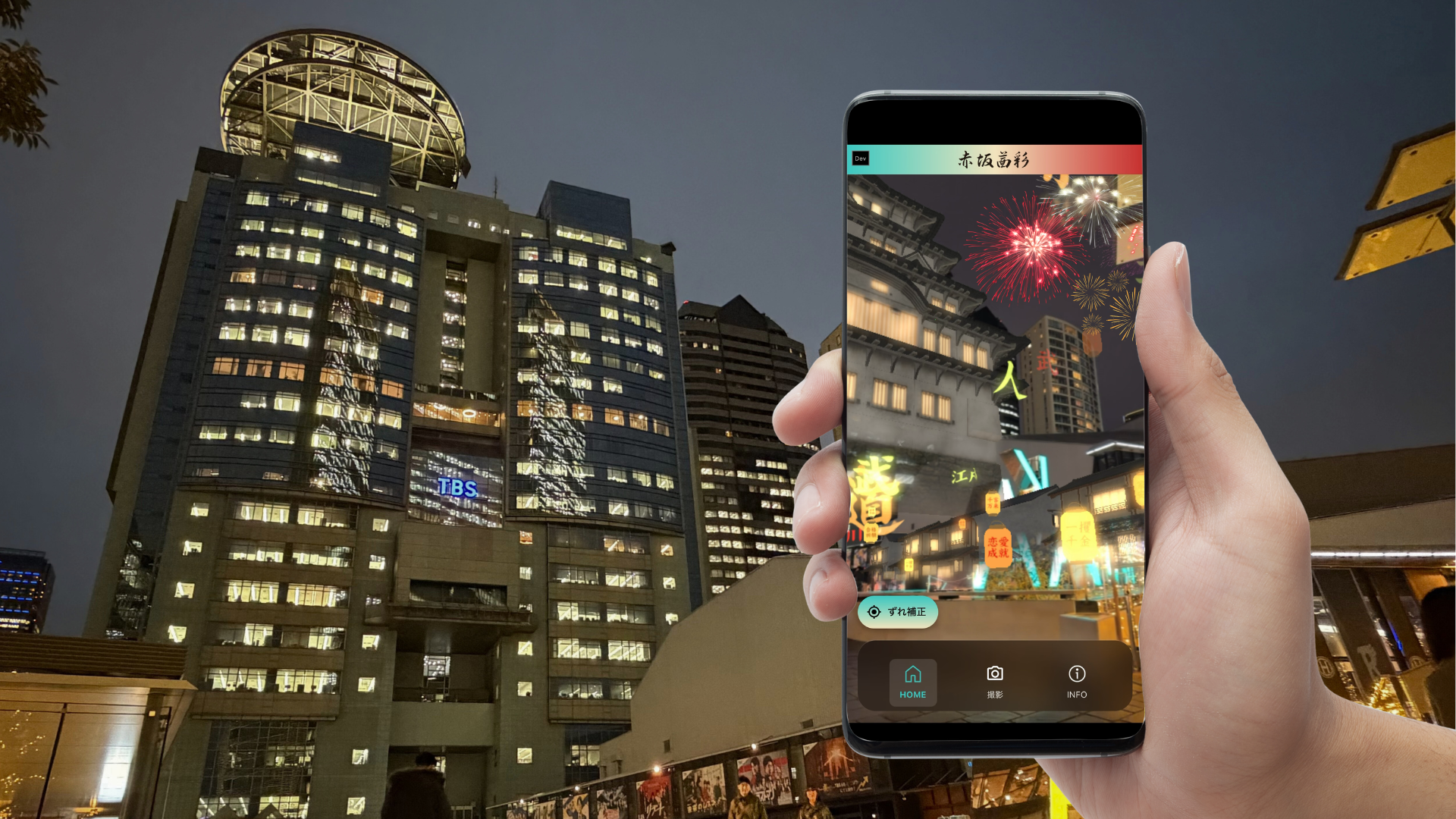 TBS放送センター前にあるTBS赤坂サカス広場内の「AKASAKA」モニュメントの前では、江戸の街にタイムスリップしたかのようなAR体験が可能です。モニュメント前にある立て看板のQRコードを読み取り、サービスを起動。TBS放送センターをはじめ、TBS赤坂サカス広場全体が江戸の街並みに変わります。高さ約100mのお城や江戸の城下町の建物が建ち並び、花火や花吹雪、提灯で彩られた世界をお楽しみいただけます。