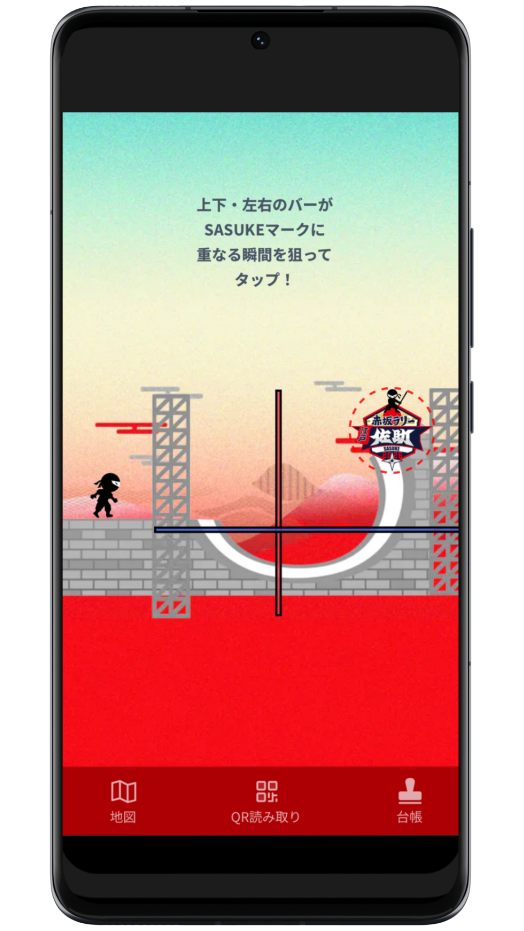 突如、赤坂に出現した初代SASUKE-その名は「江戸佐助」この「佐助」を攻略しない限り赤坂は元の時代には戻れない!赤坂の街中にたてられた木の立て看板を探し出しQRコードを読み込もう!与えられた試練を攻略すれば小判を獲得でき、小判の獲得枚数に応じてオリジナルグッズが手に入ります。