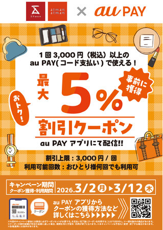 京王グループでコスメを中心に生活雑貨を販売する株式会社京王アートマン(本社:東京都多摩市、以下 京王アートマン)は、2026年3月2日(月)から2026年3月12日(木)まで対象店舗にてご利用いただける「au PAY 最大5%割引クーポン」を実施いたします。