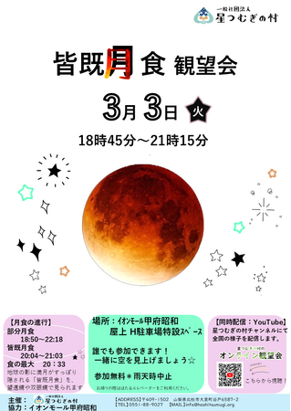 「星を介して人と人をつなぎ、ともに幸せを作ろう」をミッションに、プラネタリウム、星空観望会、星や宇宙に関するワークショップなどを展開している一般社団法人 星つむぎの村(山梨県北杜市、代表理事:跡部 浩一/高橋 真理子、以下 星つむぎの村)は、イオンモール甲府昭和の協力を得て、同店屋上駐車場にて、皆既月食観望会を開催する。