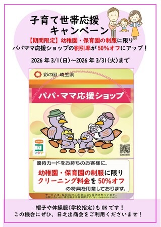 通常、パパママ応援ショップカード提示で、幼稚園・保育園・小学校・中学校・高校の制服クリーニングが10%オフのところ、幼稚園・保育園の制服に限りまして、クリーニング料金が50%オフとなる「子育て世帯応援キャンペーン」を開催します!