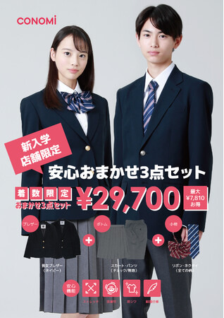 株式会社このみは、長年培った学生服の知見を生かし、圧倒的なコスパを実現した『安心おまかせ3点セット』を、着数限定で発売する。