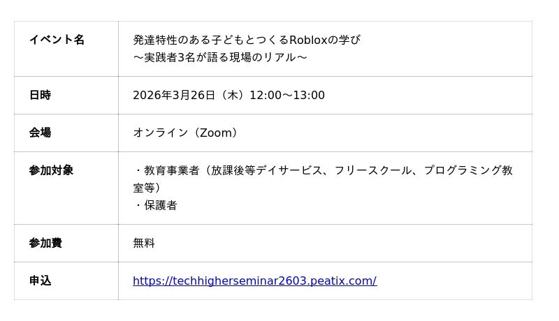 10代向けデジタル人材育成サービス『TechHigher』を運営する株式会社エクシード(本社:東京都渋谷区、代表取締役:澤部愛子)は、2026年3月26日(木)12:00~13:00、オンラインにて座談会イベント「発達特性のある子どもとつくるRobloxの学び ― 実践者3名が語る現場のリアル」を開催いたします。