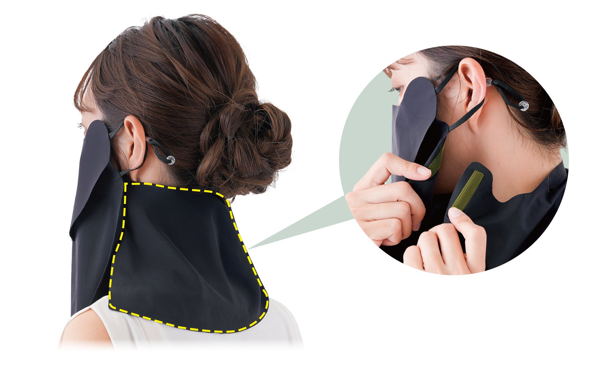 髪型を崩さず、面ファスナーで簡単に着脱できるうなじカバー付き。