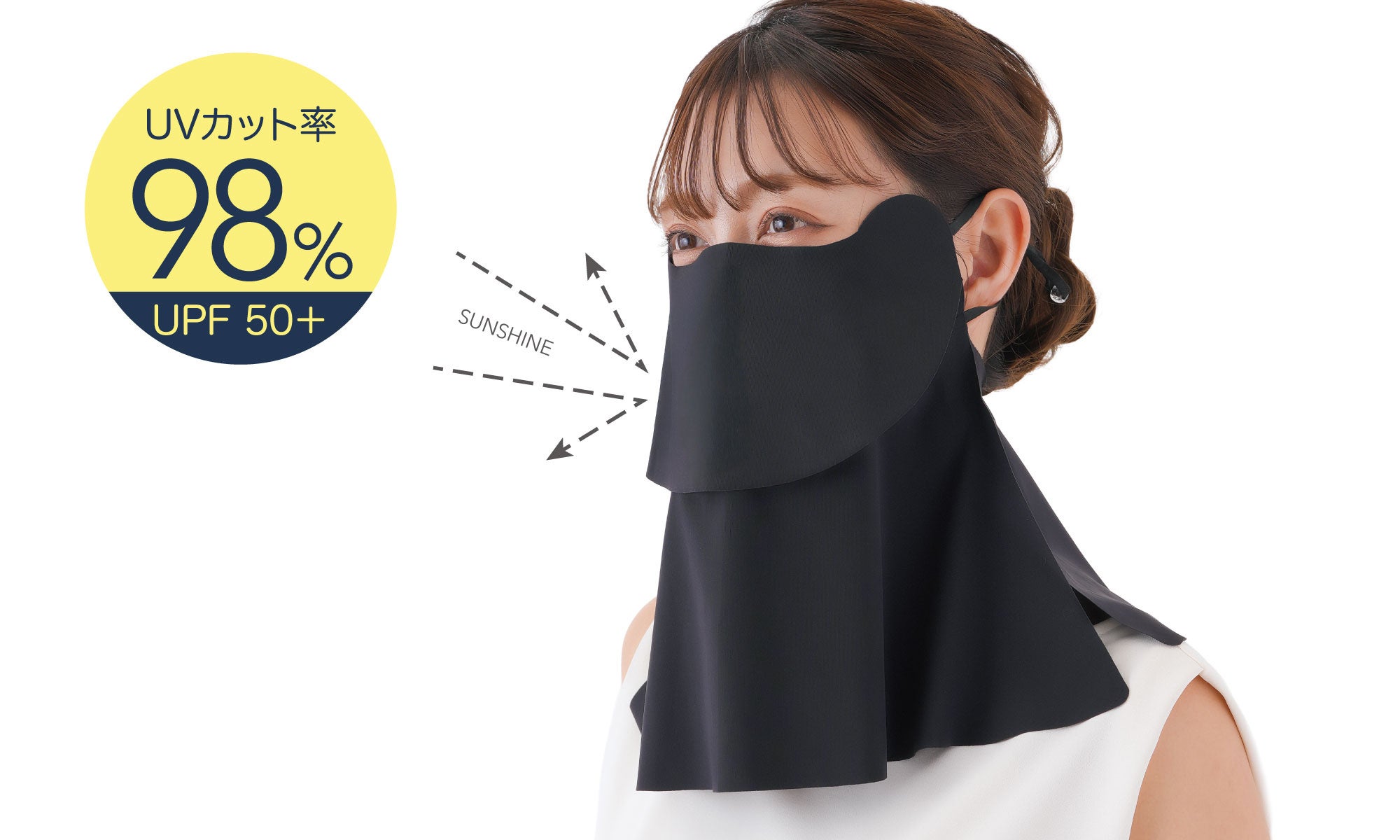 目元からうなじまでしっかり覆うデザインで、日焼けしやすい顔のほほまわりや首筋からうなじのUV対策にぴったり!