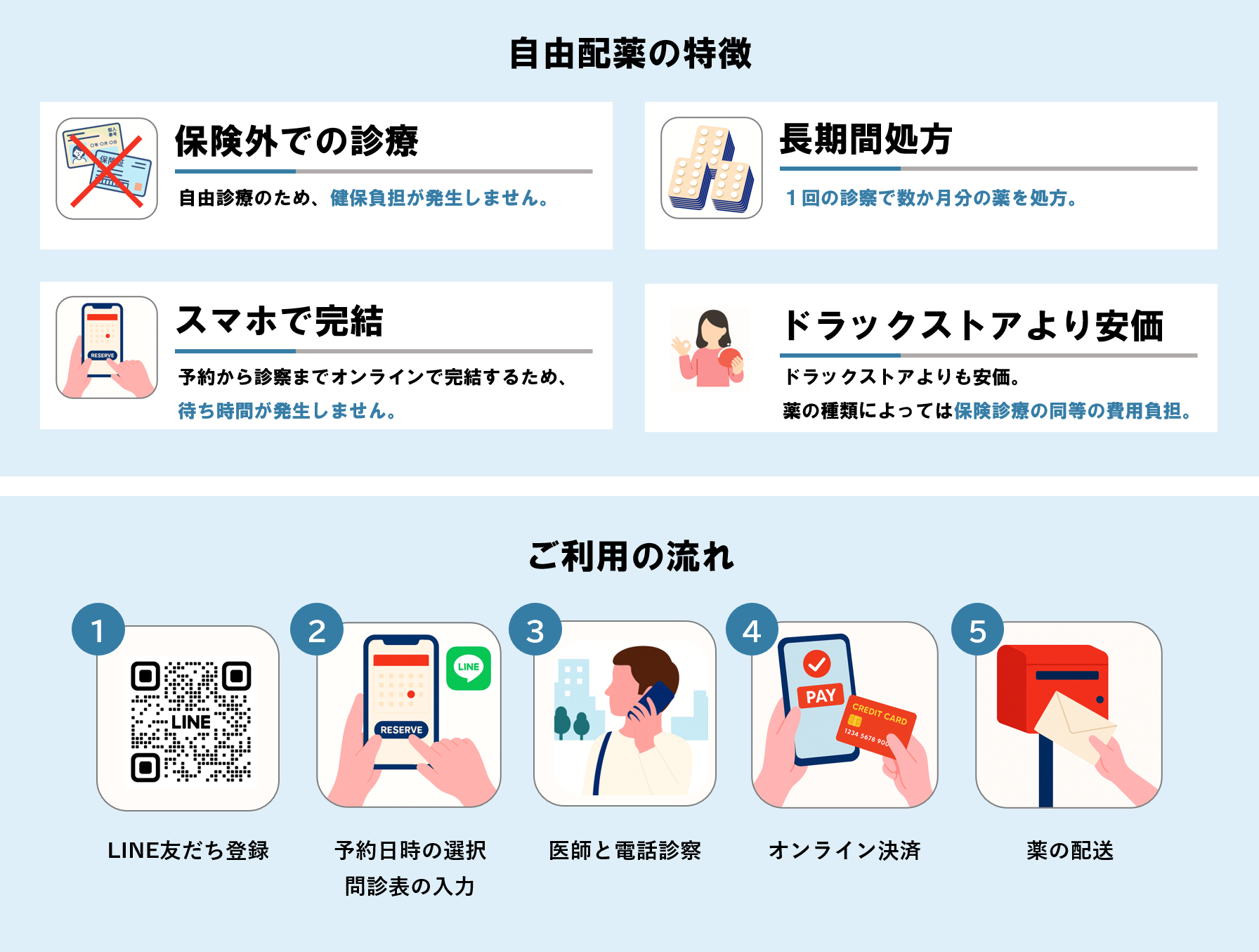 健康保険組合の財政状況は医療費の増加により年々厳しさを増しています。一方で医療提供の在り方も、花粉症のような症状でも、いつものお薬を受け取るために何度も通院しなければならない手間や薬局での長い待ち時間などに煩わしさがあります。また、ドラッグストアで販売されている市販薬は医師の診察がなく、処方薬と比較して費用負担が大きく、選択肢にも限りがあります。当院ではこうした課題に対し、自由診療を活用することで利用者の利便性を向上させると共に健康保険組合の財政にも寄与する診療・処方を提案しています。■オンライン診療サービス「自由配薬」