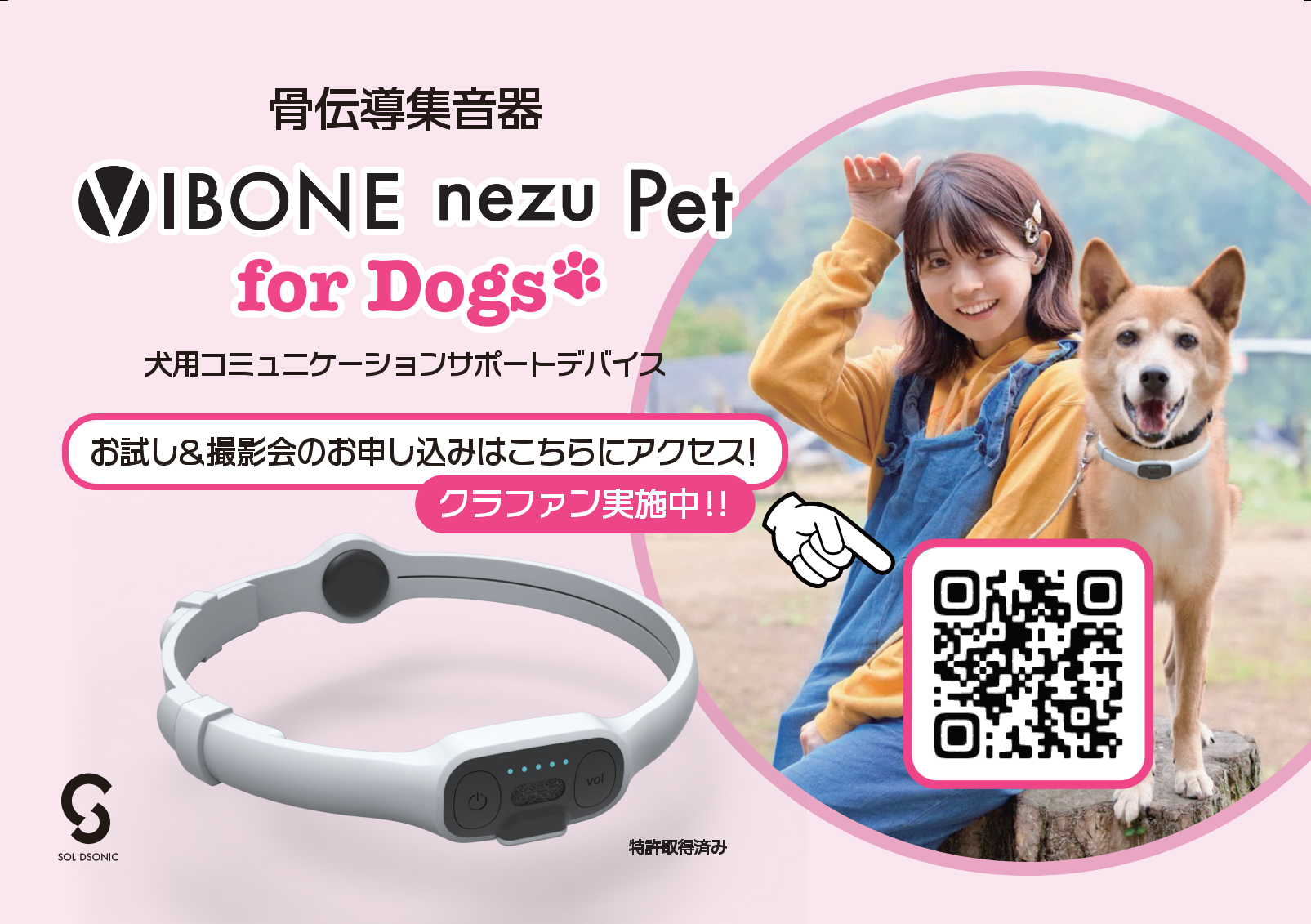 ソリッドソニック株式会社(所在地:兵庫県神戸市中央区磯上通6-1-17、代表取締役:久保貴弘、以下 当社)は、聞こえにくさを抱える愛犬とのコミュニケーションをサポートすることを目指した、首輪一体型の骨伝導集音器「Vibone nezu Pet for Dogs」を発表しました。