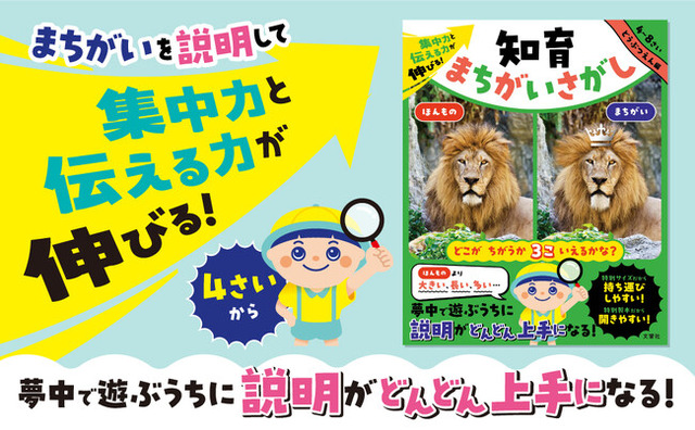 本シリーズは、写真を使った子ども向けの「まちがいさがし」。見つけた間違いは、たとえば「ほんものよりキバが長い」など、言葉で説明できるように設計されています。見比べることで観察力が、説明することで語彙力(言葉力)や伝える力が育ち、さらに「どう言えば伝わる?」と考えることで思考力も養われる、知育にぴったりの一冊です。