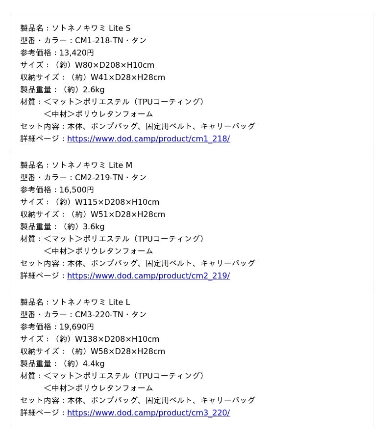 DODからは「ソトネ」シリーズとして新モデルを含め全4種を販売中。■プレミアム+コンパクトモデル「ソトネノキワミ Lite」