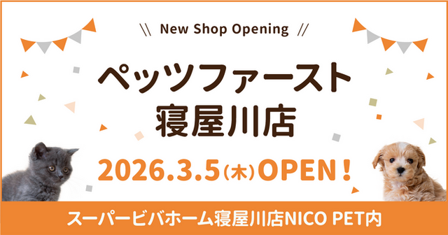 “Pets always come first”を理念に掲げるペッツファーストホールディングス株式会社(本社:東京都目⿊区、代表取締役:坂本晴彦、以下 当社グループ)は、アークランズ株式会社(本社:新潟県三条市、社長:佐藤好文、以下 アークランズ)が運営する「NICO PET寝屋川店」内にペットショップ『P’s-first寝屋川店』を2026年3月5日(木)にオープンいたします。