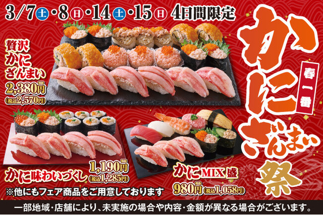 KOZOホールディングス株式会社の子会社である株式会社小僧寿しは、持ち帰りすし店「小僧寿し」にて、2026年3月7日(土)・8日(日)・14日(土)・15日(日)の期間限定で『春一番 かにざんまい祭』を開催します。