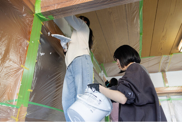 2025年12月~2026年3月にかけて、私たちは大学生たちと複数回にわたり菅島に渡航し、拠点作りを進めました。空き家の片付けから始まり、養生や下地塗り、壁塗り、照明・椅子・机の搬入、組み立てなど…。学生たちと共に手を動かしながら、拠点としての形を少しずつ整えていきました。