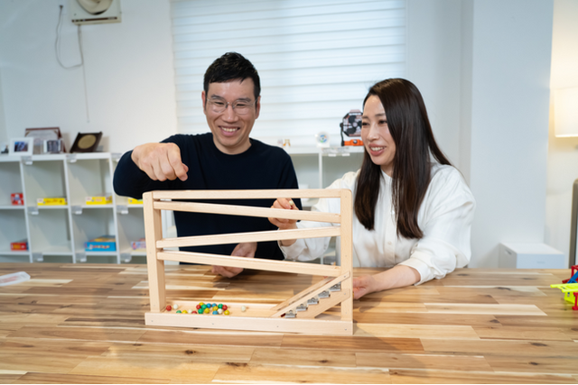 おもちゃインストラクターとして遊びの視点からおもちゃの提案を行う夫と、