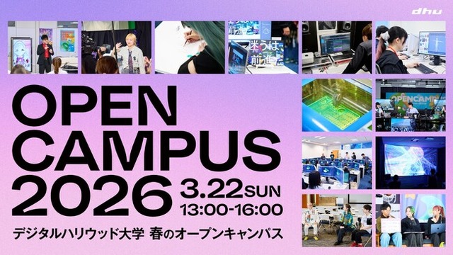 文部科学省認可の株式会社立の大学として、デジタルコンテンツと企画・コミュニケーションを学ぶデジタルコミュニケーション学部(4年制大学)と、理論と実務を架橋し新たなビジネスを生み出すデジタルコンテンツ研究科(専門職大学院)を設置するデジタルハリウッド大学(DHU、所在地:東京・御茶ノ水、学長:杉山知之)では、2026年3月22日(日)に「春のオープンキャンパス2026」を開催します。