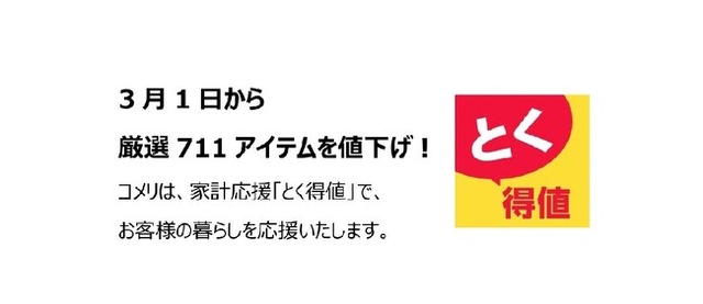 この度、2026年3月1日から新たにコメリのオリジナル商品を含め711アイテムを期間限定で値下げいたしました。コメリグループは、今後もお客様がいつご来店いただいても安心してお買い物ができる、お客様に寄り添った店づくりを継続し、「豊かで快適な暮らし」のお役に立てるよう努めてまいります。