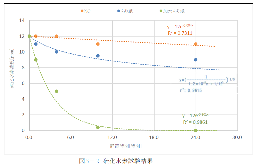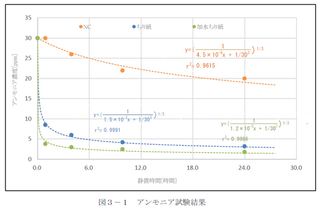 アンモニアのグラフでは、青色と緑色の線が、すぐに下降しているのが分かります。具体的な数字では、水分を含んだ「めりふわ」(加水ちり紙)は54分(0.9時間)経たずに、においの実測値が約87%減少しました。9時間48分(9.8時間)後は92%減っています。