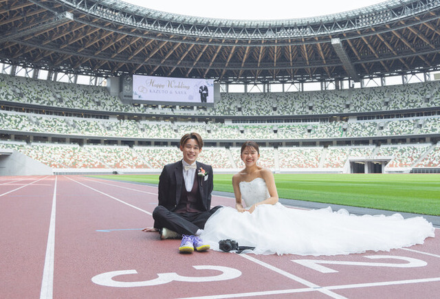 今回ウェディングフォトを実施されたのは、昨年10月にご入籍された飯澤千翔(いいざわかずと)さん、紗耶(さや)さんご夫妻です。新郎は実業団で陸上競技に取り組まれており、今年春から大会に向けた合宿に入る予定であることから、「その前にウェディングフォトを撮影したい」と検討を進めていらっしゃいました。そうした中、新婦の紗耶さんが国立競技場でのウェディングフォトが可能であることを知り、新郎へ相談され、おふたりにとって思い入れのある特別な場所で撮影したいとの想いから、今回の撮影が実現しました。
