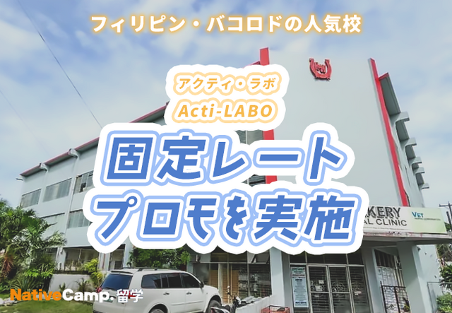 ネイティブスピーカーと回数無制限のオンライン英会話サービス「ネイティブキャンプ英会話」を展開する株式会社ネイティブキャンプ(東京都渋谷区 代表取締役:谷川国洋)は、海外留学エージェントサービス「ネイティブキャンプ留学」において、フィリピン・バコロドの語学学校 Acti-LABO にて、固定レートプロモーションを実施いたします。
