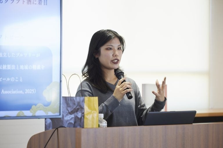 内田さんは、「クラフト酒は”This is Japan“と一言で表せるものではなく、”これも日本”だと再発見するためのポータブルな文化媒体」と結論付け、今後は、広島で気軽にクラフト酒に触れられる機会を増やし、文化への関心を広げる取り組みを継続していきたいと卒業後の展望を話しました。