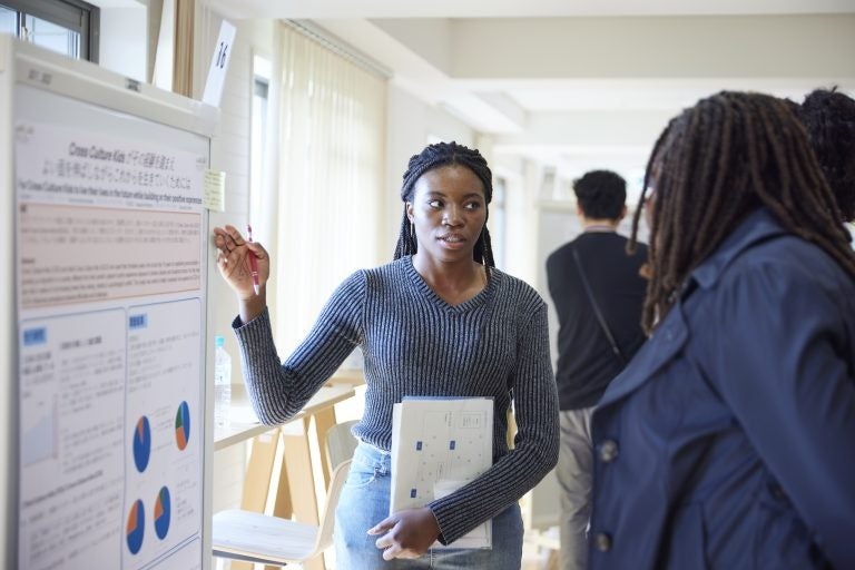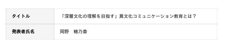 岡野さんは海外留学での経験を発端に、異文化コミュニケーションにおいて、マナーやルールといった表層文化だけでなく、そのマナーが生まれた背景などの深層文化までを理解する必要があると考え、より良い異文化コミュニケーション教育について分析しました。