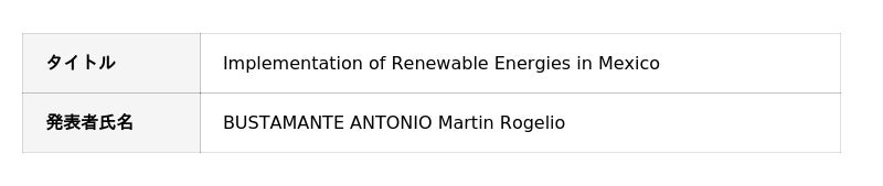 大学進学を機に来日したMartinさんは、飛行機の窓から一面に広がるソーラーパネルを目にし、大きな衝撃を受けたといいます。母国メキシコでは再生可能エネルギーの普及がほとんど進んでおらず、日本の取り組みから学べることがあるのではないかと考え、卒業プロジェクトで政策提言に取り組みました。