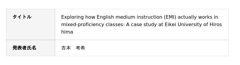 吉本さんは、叡啓大学のEMI(英語開講授業)のように学生の英語力に差がある環境において、EMIが日本語授業と比べてどのような学習効果をもたらすのかを調査しました。EMIを受講した学生や担当教員へのインタビューを通して、EMIと日本語授業の学習成果はおおむね同等であることが明らかになりました。一方で、EMIでは日本語授業以上に異文化間の対話が活発になり、社会階層や人権差別といった倫理的課題についても、より多角的で深い議論が生まれる傾向が見られました。